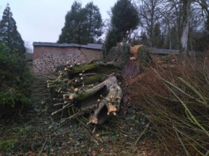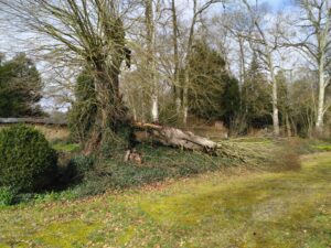 Suite à la tempête de l'hiver 2023, un tilleul qui aurait plus de 500 ans à été cassé en deux. Il a hélas fallut le supprimer entièrement.